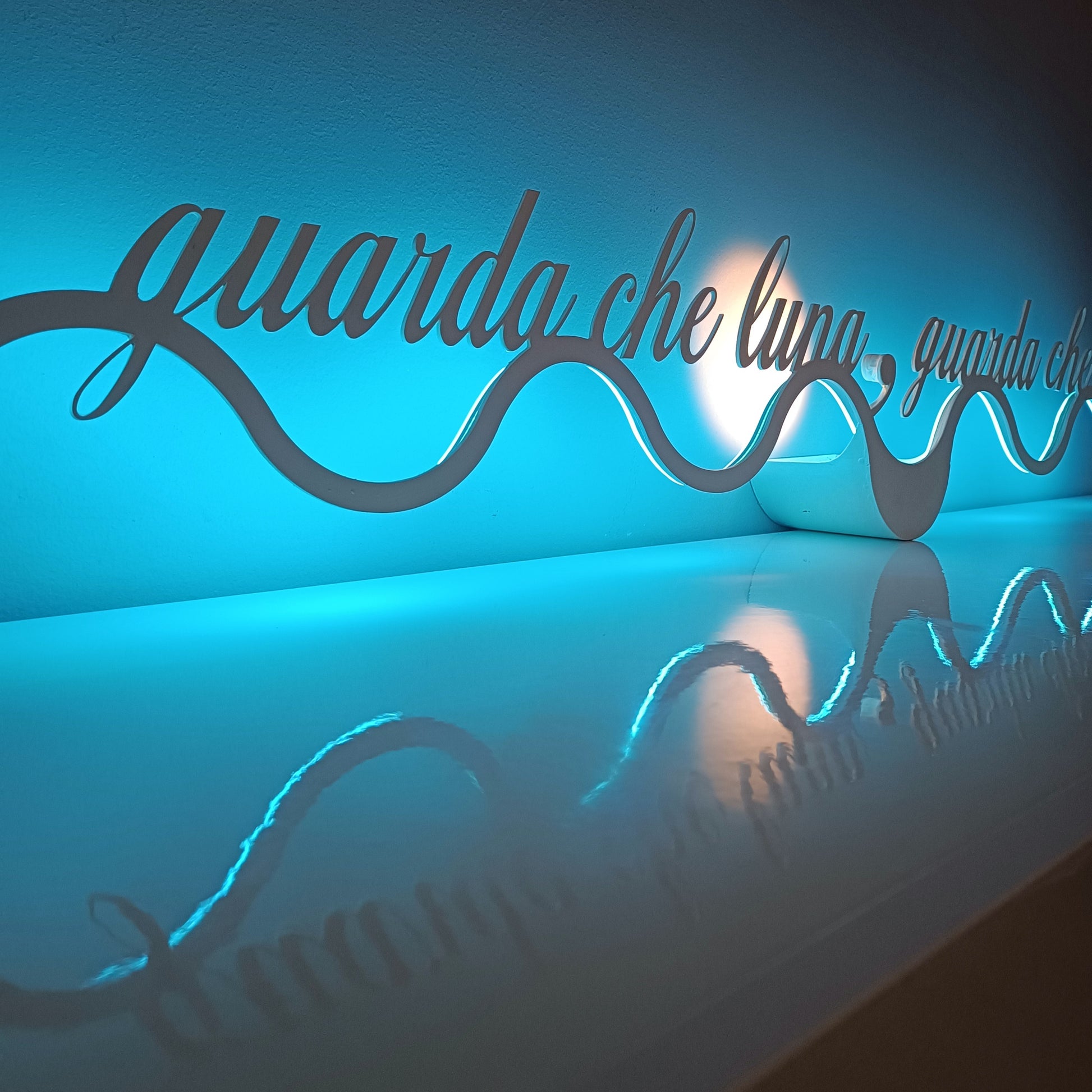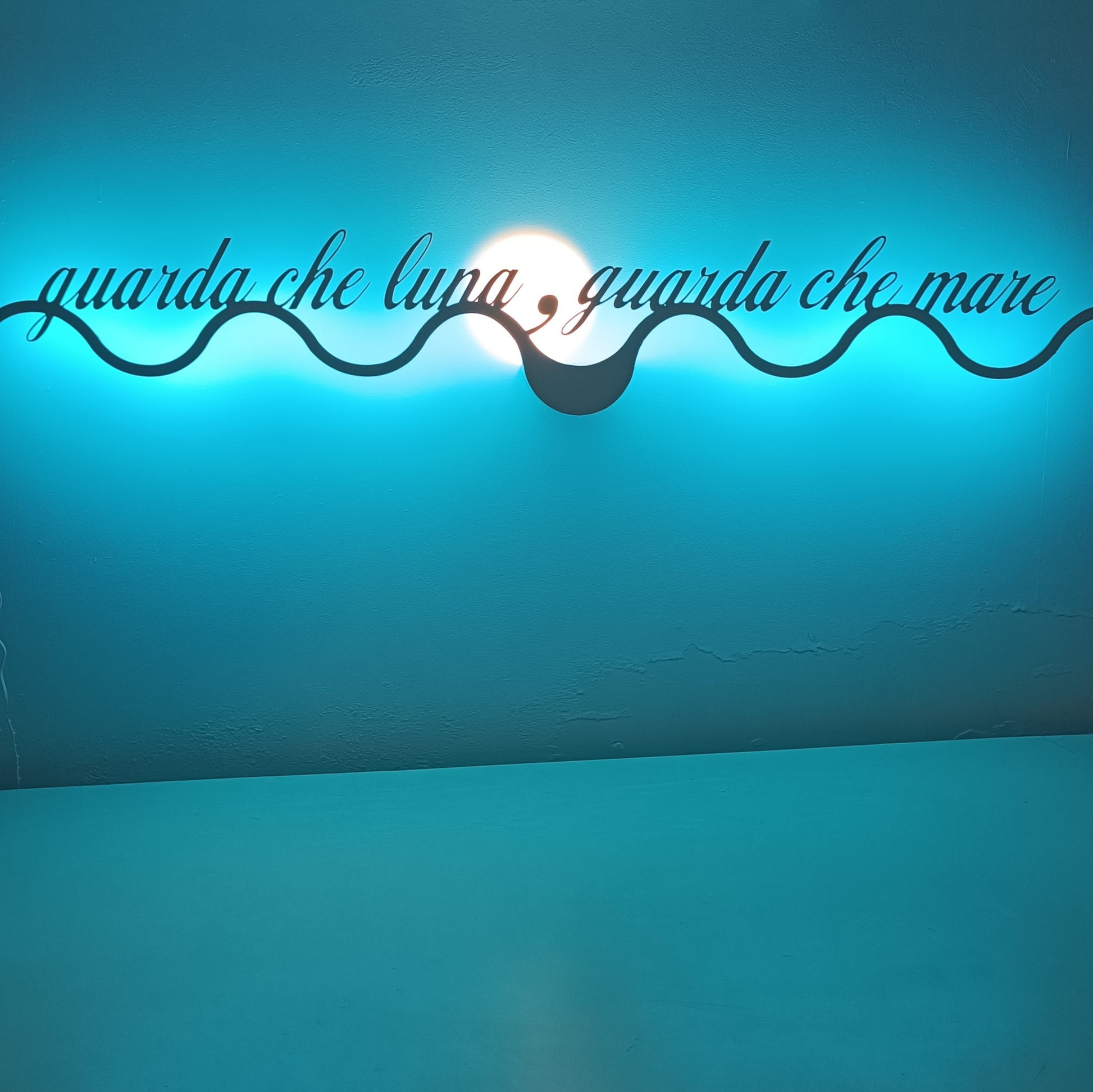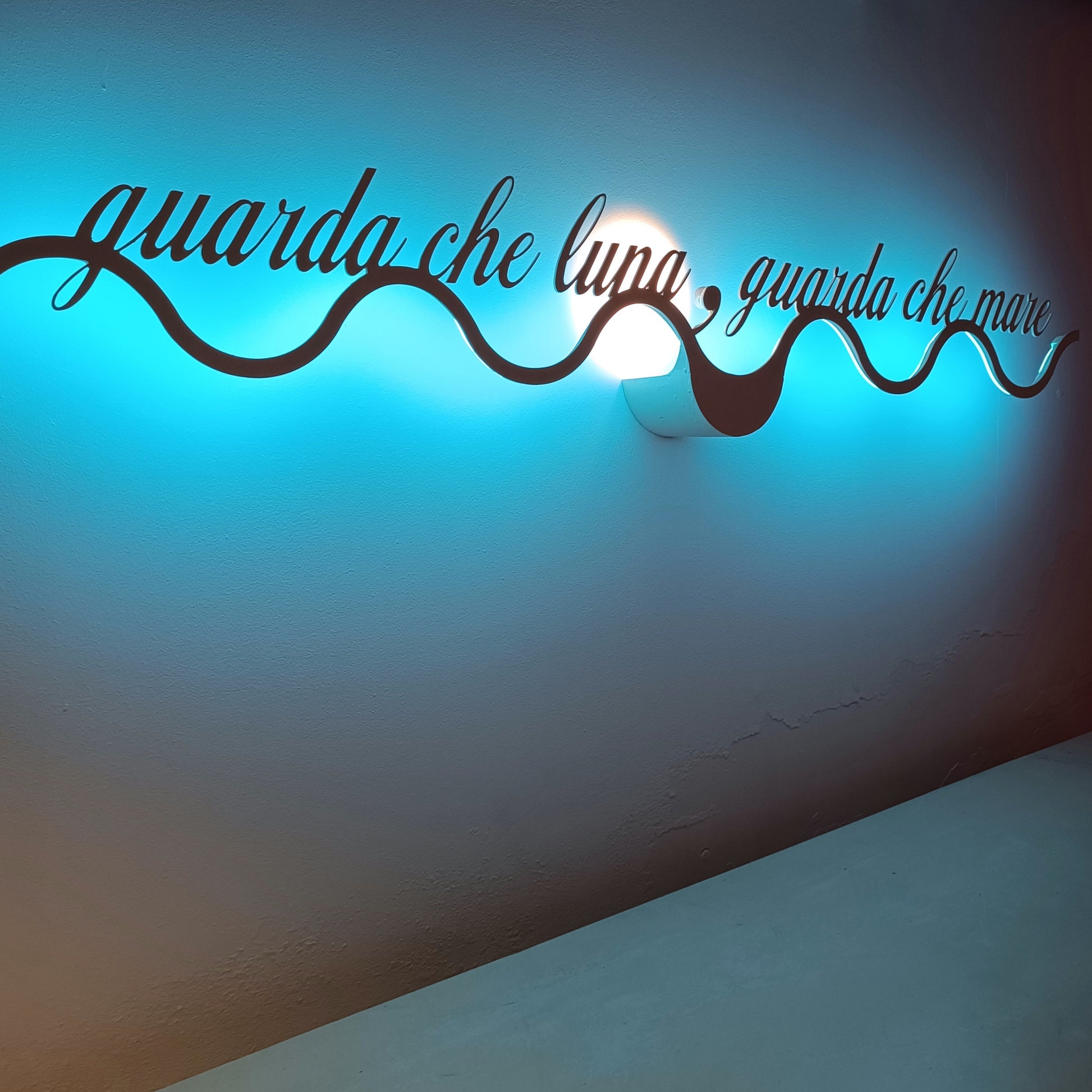 "Guarda che luna" is a wall lamp with a turquoise and white indirect light, reminding a full moon over the sea.