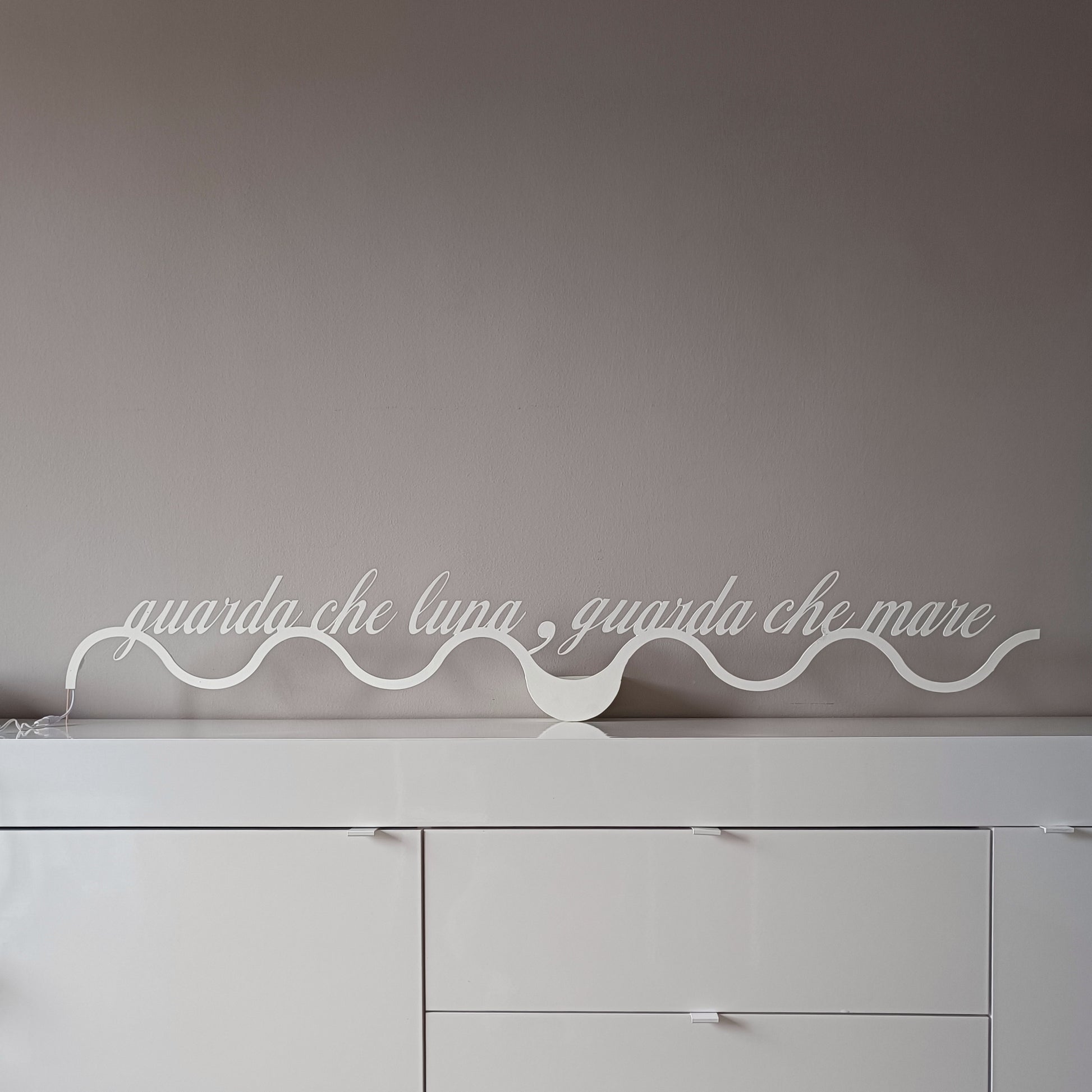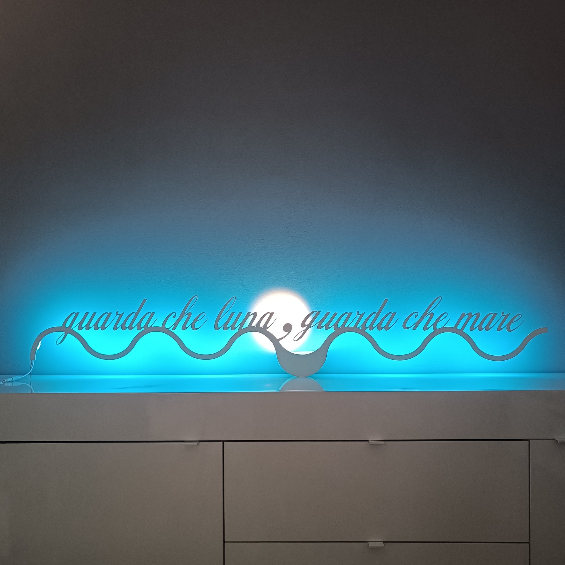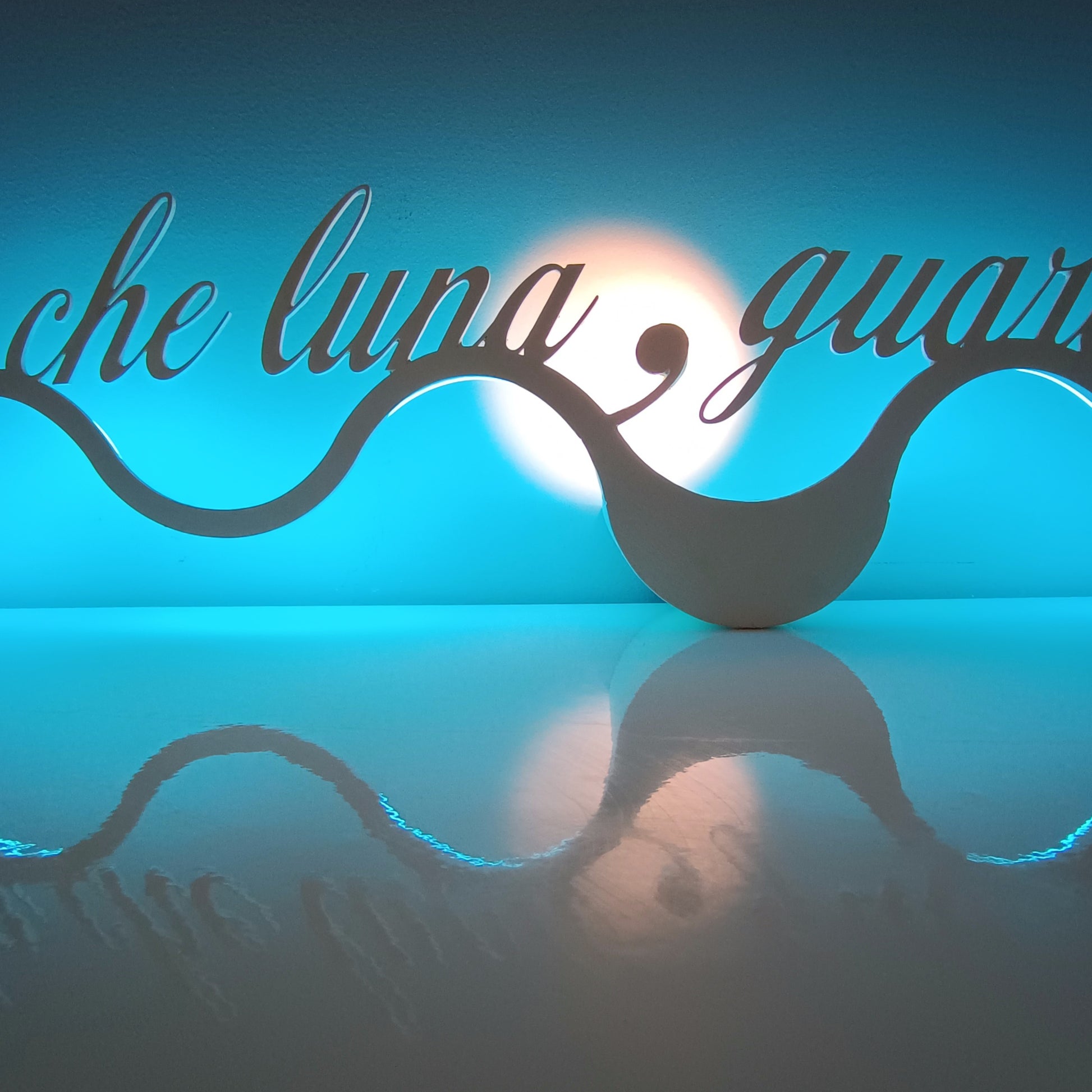 "Guarda che luna" is a wall lamp with a turquoise and white indirect light, reminding a full moon over the sea.